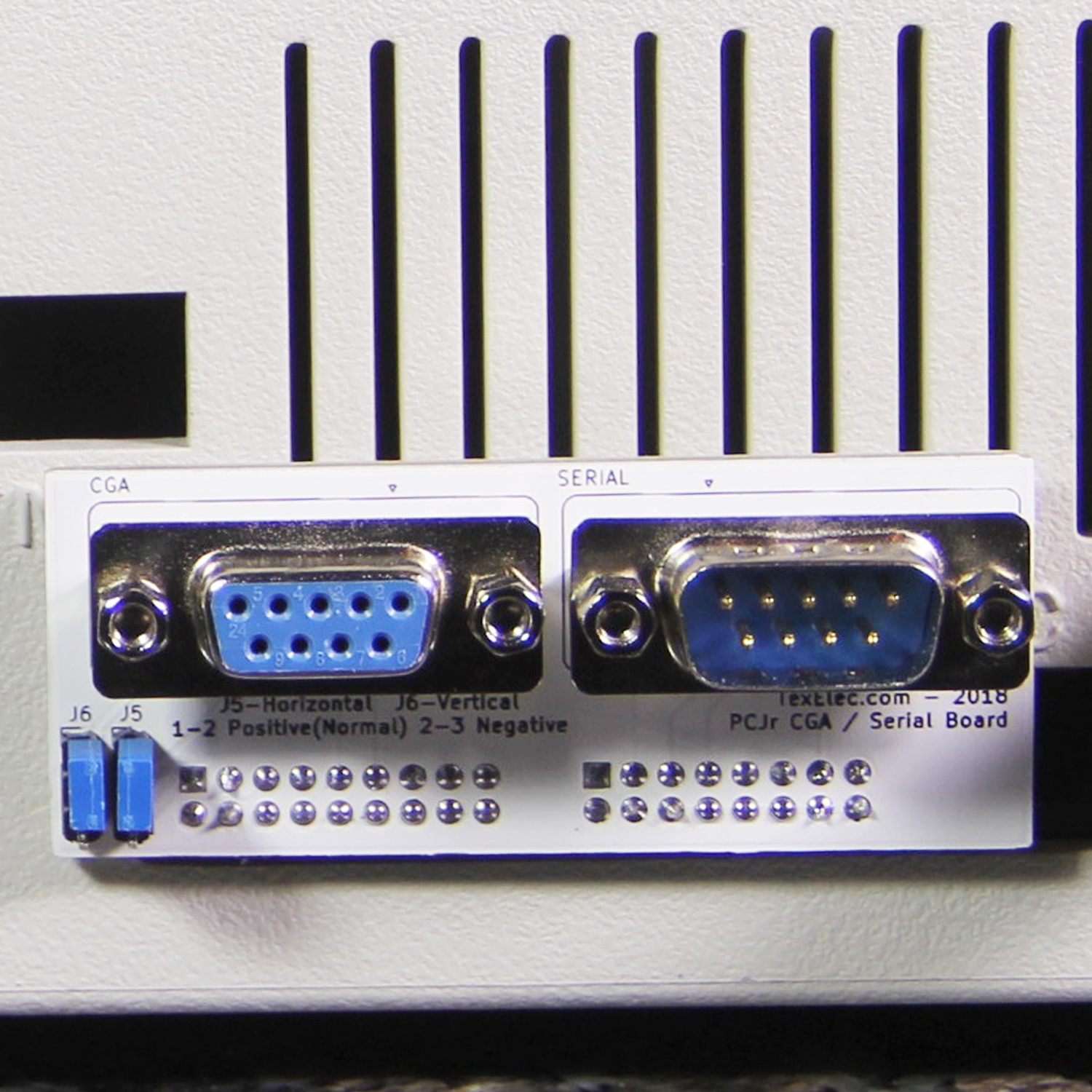This board is designed to plug into the back of your PCjr, and allow you to connect a standard CGA monitor and a standard Serial device. It is difficult and expensive to find the original cables for the proprietary ports on the PCjr, and this board allows you to have the ports this machine should have had all along! This board has two jumpers which allow you to change the polarity of the horizontal and vertical output pins from positive to negative. Most monitors will work fine with the default settings, but the PCjr offered negative polarity on its port so we made the settings available.